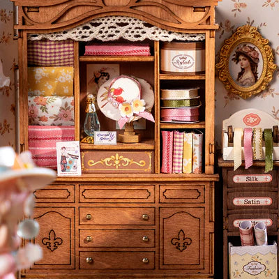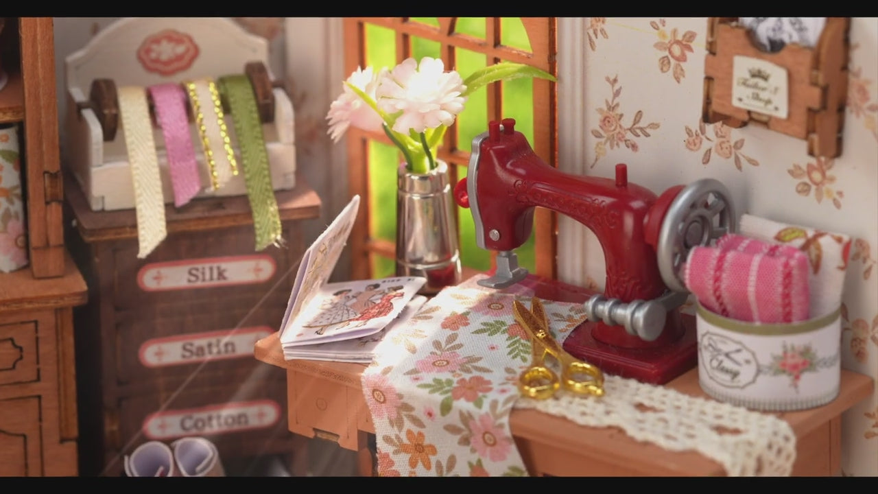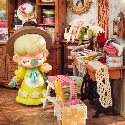 O Ateliê de Costura Retrô Casa Miniatura DIY recria um estúdio de costura vintage com manequim, máquina a pedal, fitas de seda, rendas e caixas de chapéu. Uma montagem relaxante que resulta em uma peça elegante para decorar e inspirar, celebrando o charme da moda feita à mão.