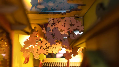 Kit 3D em madeira para montar com as próprias mãos. Ao finalizar, ele revela um lindo cenário japonês com cerejeiras em flor e construções tradicionais. É perfeito para decorar estantes ou qualquer ambiente da casa. Quando as luzes LED são acesas, o cenário ganha um brilho acolhedor e mágico. Além de lindo, é um projeto DIY relaxante e criativo — ideal para presentear crianças e adultos.