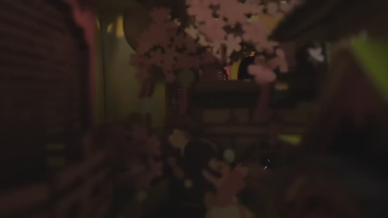- Design inspirado em ruas japonesas na primavera, com cerejeiras, ponte e rio iluminado.