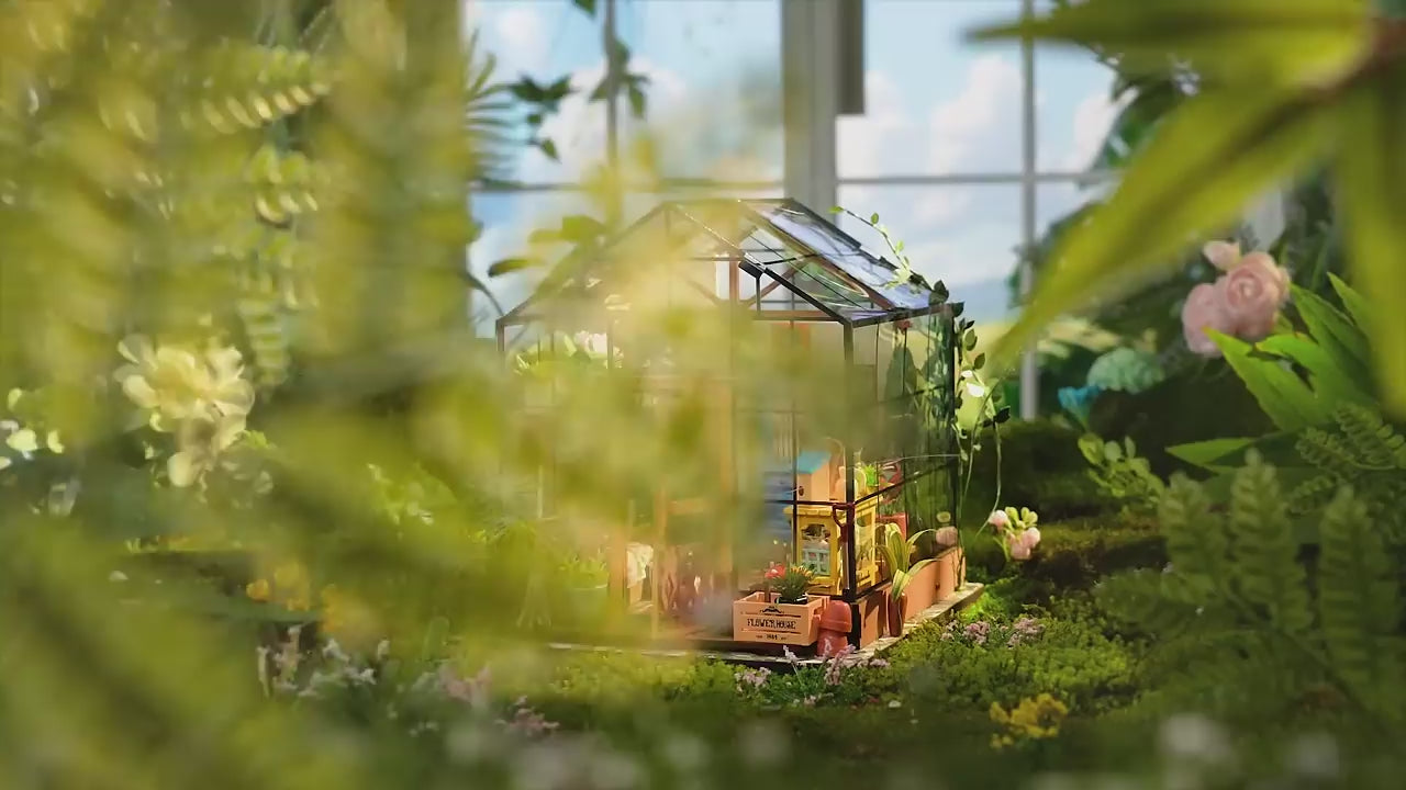 Uma charmosa estufa em miniatura repleta de flores, plantas e prateleiras de madeira. Um kit DIY relaxante que vira uma peça de decoração luminosa e colorida para a sua estante, trazendo o encanto de um jardim para dentro de casa.