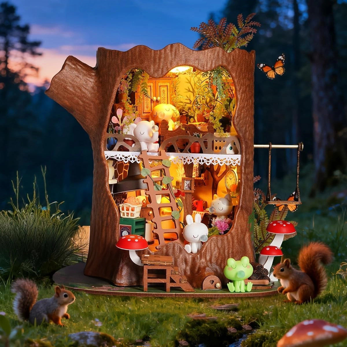 Entre em um bosque encantado com a Casa na Árvore de Conto de Fadas, uma casa em miniatura DIY que transforma um tronco oco em um lar mágico cheio de detalhes e luz.