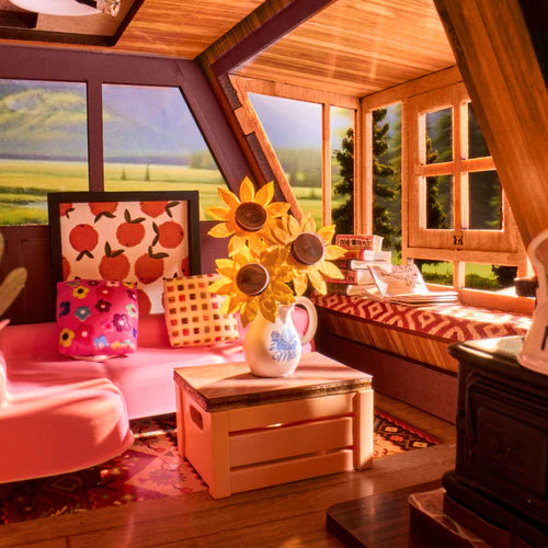 O interior iluminado e cheio de vida inclui sala de estar ensolarada, quarto no sótão, varanda com jardim e móveis em madeira com acabamento realista, tudo feito para recriar a sensação de um retiro de montanha perfeito.