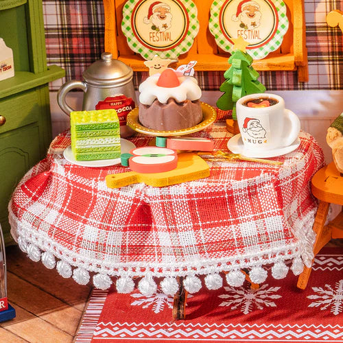 Enquanto o frio fica do lado de fora, sirva-se de um chocolate quente ou gemada na caneca do Papai Noel, e saboreie as delícias natalinas, como bolo de camadas e pudim. Ao redor da mesa, há árvores decoradas com bonecos de gengibre, presentes, guirlandas, flocos de neve e enfeites pendurados que completam o clima de celebração.