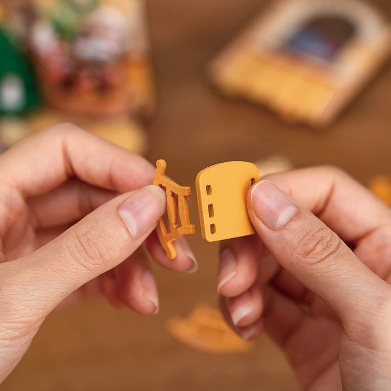 Cada kit inclui peças de madeira pré-cortadas e pintadas, instruções passo a passo, componentes de iluminação LED e materiais especiais necessários para a cena.