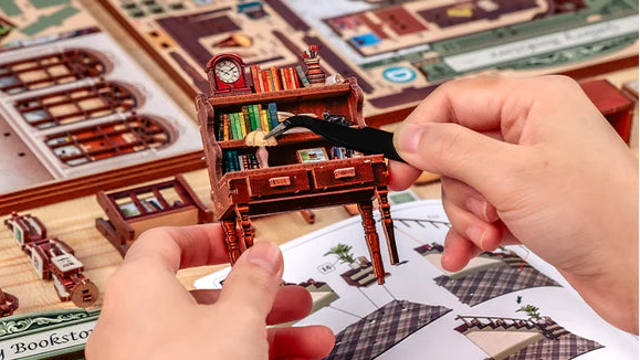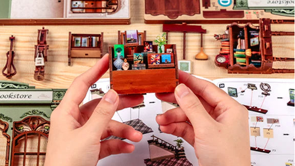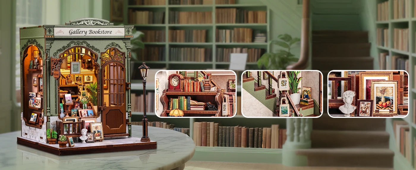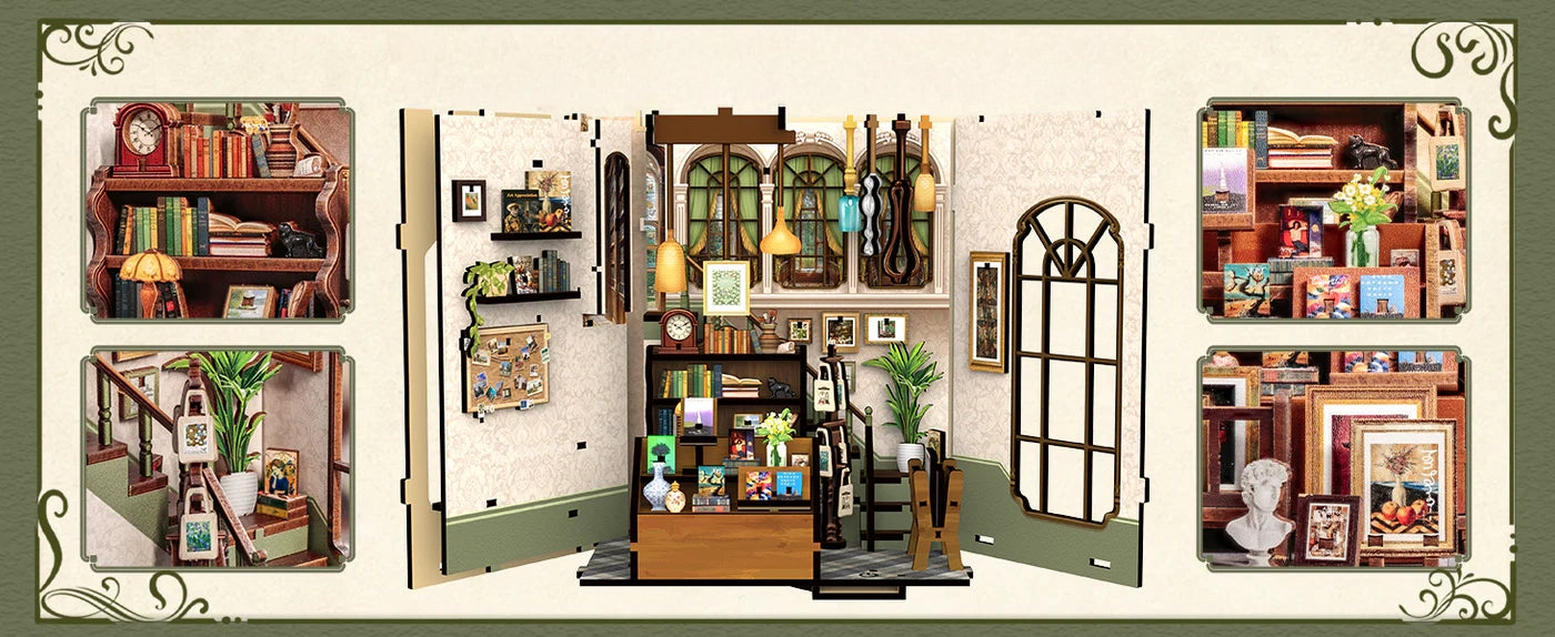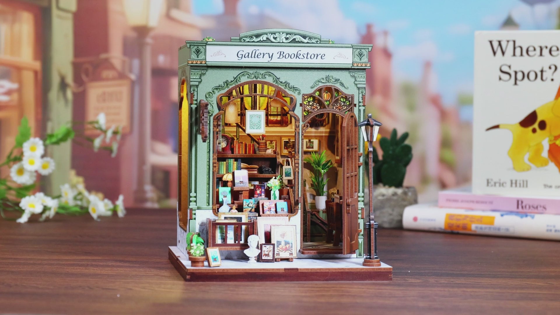 A Livraria & Galeria de Arte Casa Miniatura DIY é um kit de montagem detalhado que recria uma charmosa livraria artística, onde livros, quadros e esculturas se misturam em um ambiente acolhedor e sofisticado. Inspirada em pequenas galerias europeias, a miniatura combina estantes repletas de livros, obras de arte emolduradas, iluminação quente e uma porta funcional que protege o interior contra poeira. Ideal para quem aprecia leitura, arte e projetos criativos, é uma peça decorativa que transforma qualquer espaço em um refúgio cultural em miniatura.