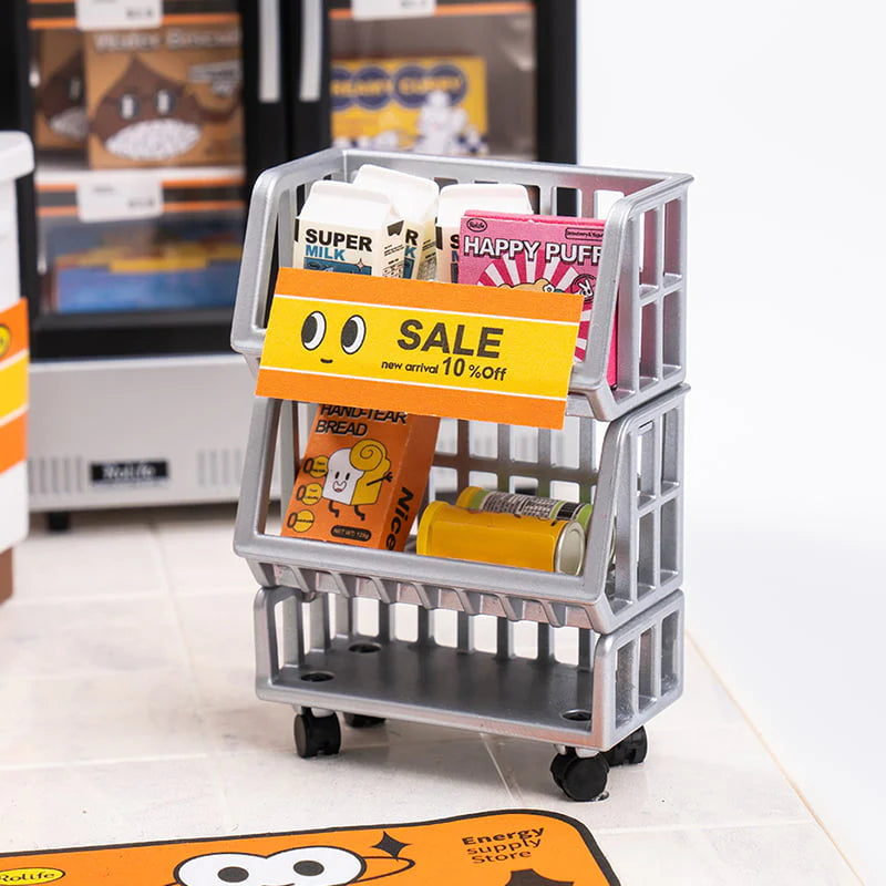 O carrinho de promoções do dia adiciona dinamismo e autenticidade, perfeito para quem adora miniaturas cheias de movimento.