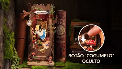 Deixe a imaginação te guiar para um espaço criativo e relaxante com o Mergulho no País das Maravilhas. A fachada lembra um enorme tronco de árvore com degraus naturais, enquanto a entrada em formato de fechadura convida a descobrir mistérios internos. Lá dentro, você encontrará pratos decorativos, quadros, espelhos secretos, cogumelos curiosos, livros antigos, jogos de tabuleiro e a famosa frase: “A imaginação é a arma na guerra contra a realidade”. Um Book Nook único para quem ama fantasia.