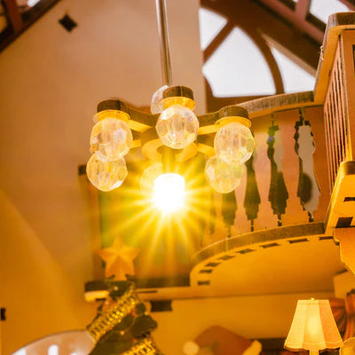Além da lareira, um lustre suspenso ilumina o ambiente. Os LEDs são alimentados por duas pilhas AAA.