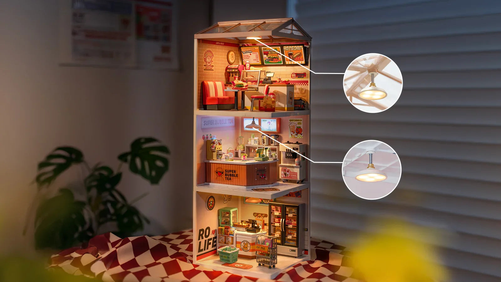 Com iluminação ajustável, portas de conexão Type-C e compatibilidade com outras casas da Série Super Criador, este restaurante é o complemento perfeito para expandir seu mini mundo Minilife.