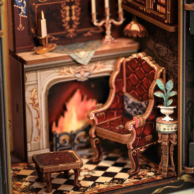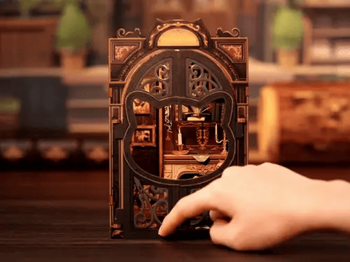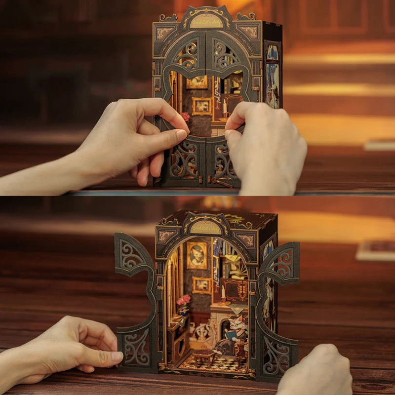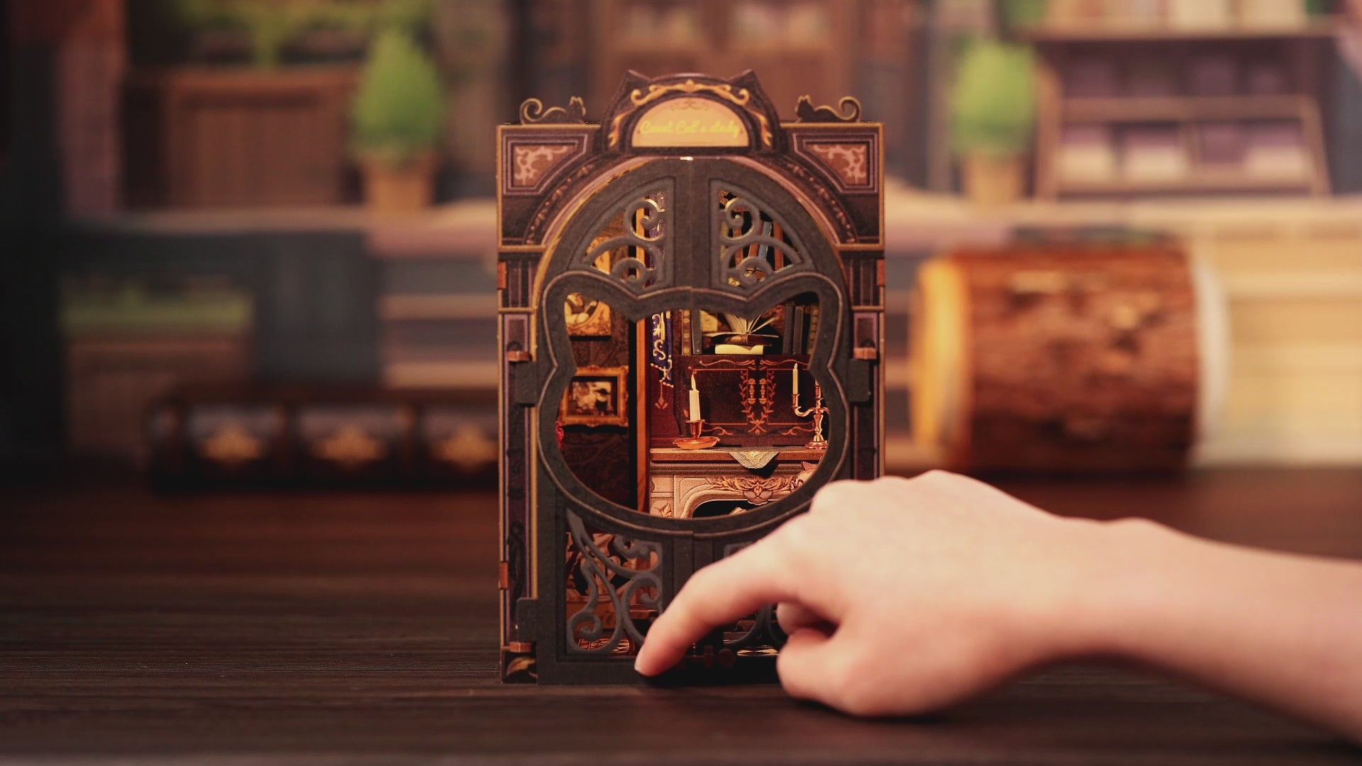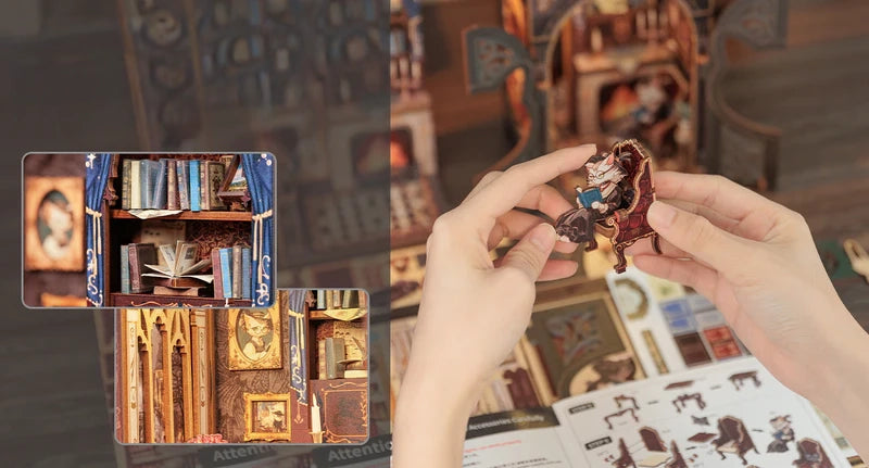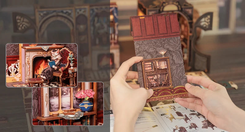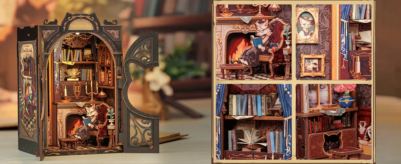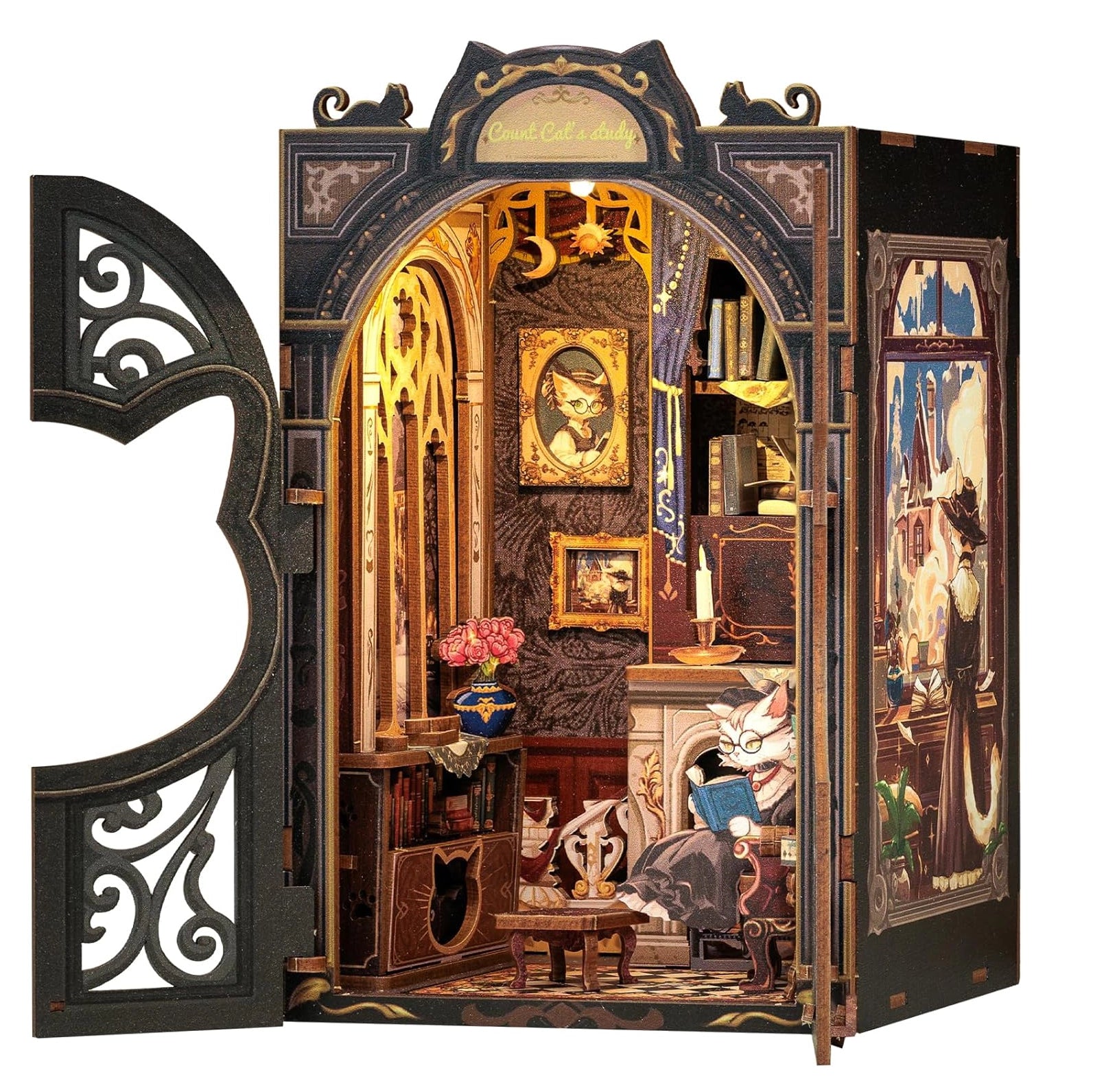 Entre no misterioso refúgio do Sala de Estudo do Conde Gato Book Nook DIY. Um espaço elegante e acolhedor para os amantes de livros e miniaturas. Atravesse a porta em formato de cabeça de gato e descubra um ambiente repleto de serenidade, móveis clássicos e detalhes encantadores. Feito com peças de madeira premium pré-cortadas, o kit é fácil de montar, relaxante e ideal para quem ama projetos DIY.