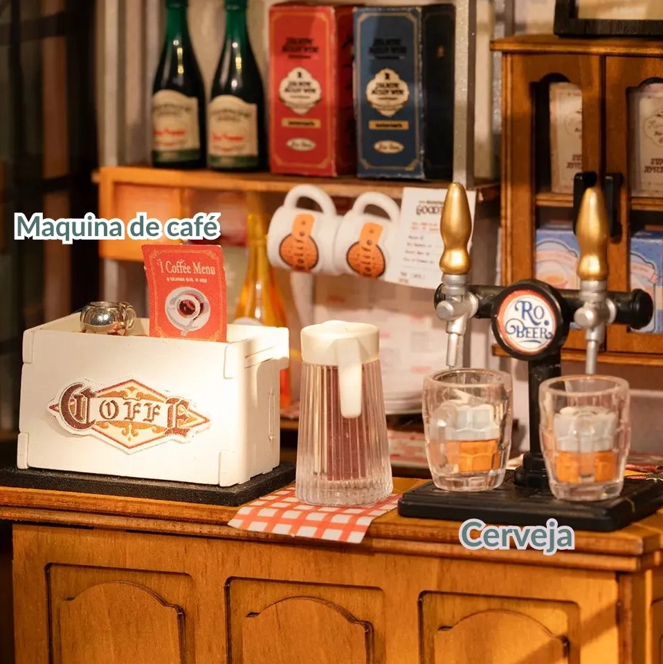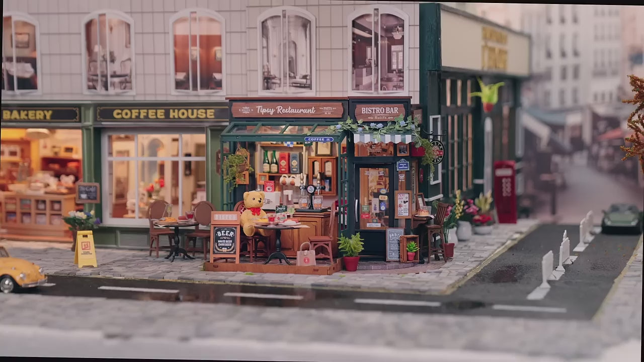 Clientes famintos se reúnem no Tipsy Bistrô, um restaurante e bar em miniatura repleto de boa comida, drinks e charme vintage. Este aconchegante bistrô traz um toque europeu com fachada verde e marrom, toldos listrados e uma atmosfera acolhedora perfeita para quem ama montar e decorar miniaturas com realismo e personalidade.
