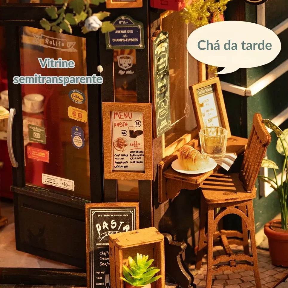 Com 297 peças, o projeto recria um pequeno bistrô cheio de vida, com mesinhas externas, taças, garrafas de vinho, pratos detalhados e um ambiente iluminado por uma luz suave e aconchegante. O resultado é um cenário digno de vitrine, perfeito para quem ama miniaturas realistas, decoração artesanal e experiências relaxantes de montagem.